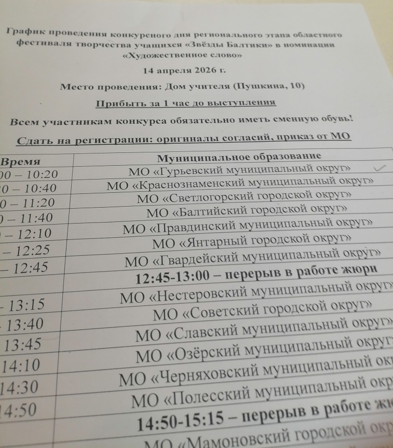 Очередному этапу регионального областного фестиваля творчества учащихся «Звёзды Балтики» в номинации «Художественное слово» 14 апреля в 10 утра в Доме Учителя города Калининграда был дан старт, когда обворожительная ведущая Елизавета Чайко объявила о начале конкурса и представив конкурсантам состав жюри, пожелала обеим сторонам успеха. Шестьдесят шесть участников в возрастных категориях от 7 до 17 лет, победивших в муниципальных этапах, оспаривали право быть первыми, или разделив почётные вторые и третьи места, гордо носить звание победителей Художественного слова Балтики! Коллективу жюри конкурса, в котором я представляла Союз писателей России, предстояла ответственнейшая и архитрудная задача проанализировать выступления ребят и в жарких спорах выявить истину, а именно – победителей. Но в определении самых достойных, мнение было единодушным. Таких, действительно заслуживающих поощрения ребят, было много. По этому есть и обладатели Гран-при, и отличившиеся в эмоциональном прочтении...