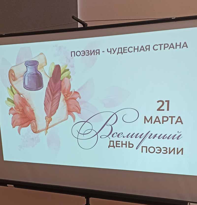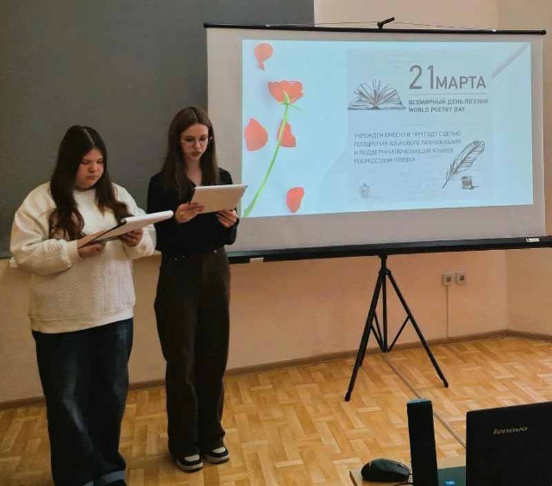 Сегодня библиотека нашего Технологического колледжа стала местом настоящего поэтического праздника, приуроченного ко Всемирному дню поэзии. Ведущие мероприятия Суранова Софья и Шахман Марина вместе с педагогом-библиотекарем Напалковой Е.В. провели небольшую экскурсию в историю праздника, напомнив собравшимся, что Всемирный день поэзии был учреждён ЮНЕСКО в 1999году и отмечается ежегодно 21 марта. Этот день призван напомнить обществу о значимой роли поэзии традиций в культуре и жизни человека, подчеркнуть важность сохранения и распространения творчества среди молодёжи.