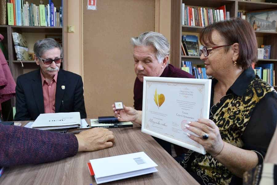 Сергей Гошев прочитал отрывок из своего рассказа «Фотография, ожившая в бронзе», который посвящён первым переселенцам нашей области. Рассказал, как в Санкт-Петербурге получал нагрудный знак «Искусство слова». В статуте знака написано: «За преданность литературному искусству, обогащение литературного пространства и передачу вечных ценностей через литературное творчество».